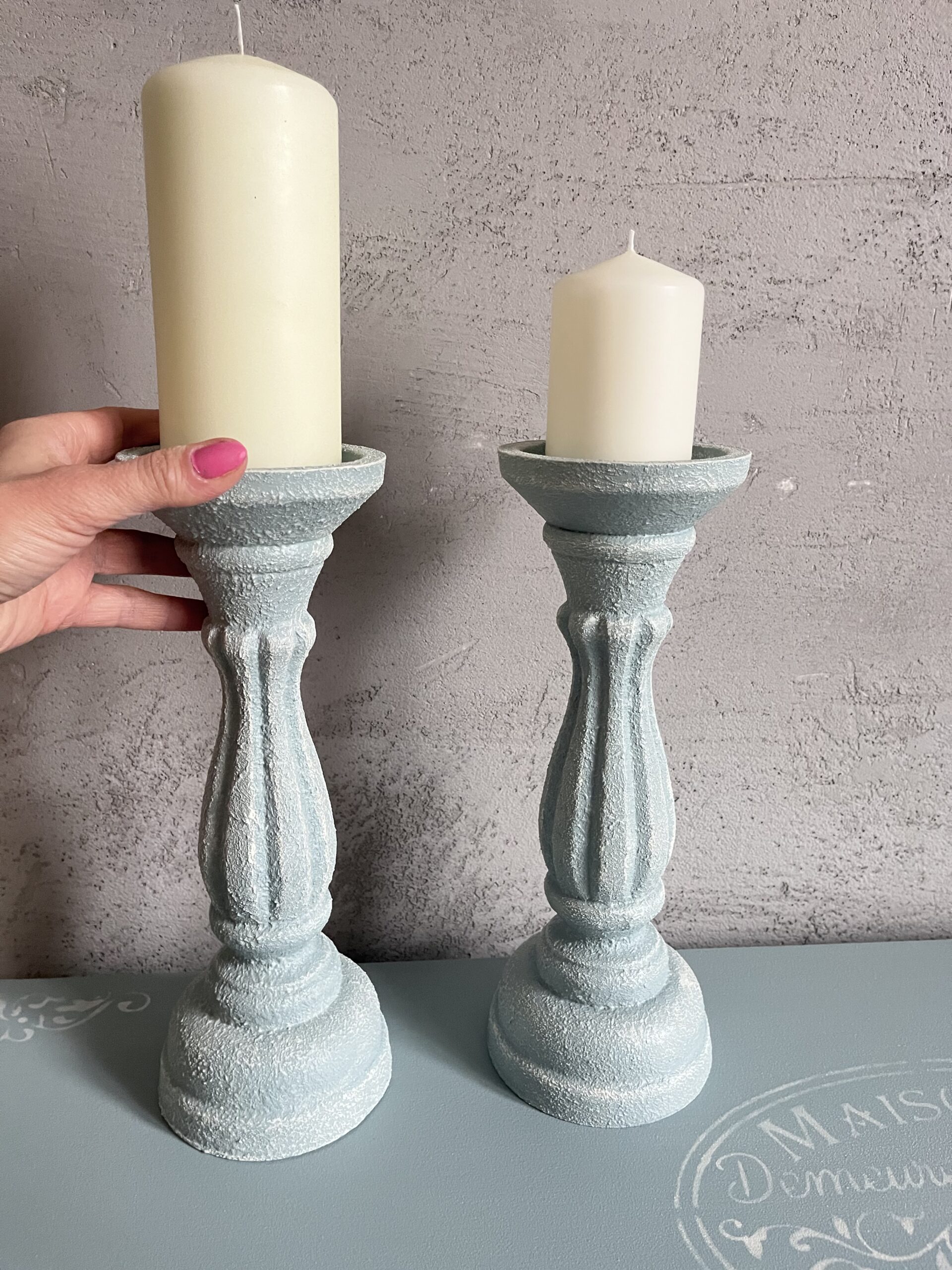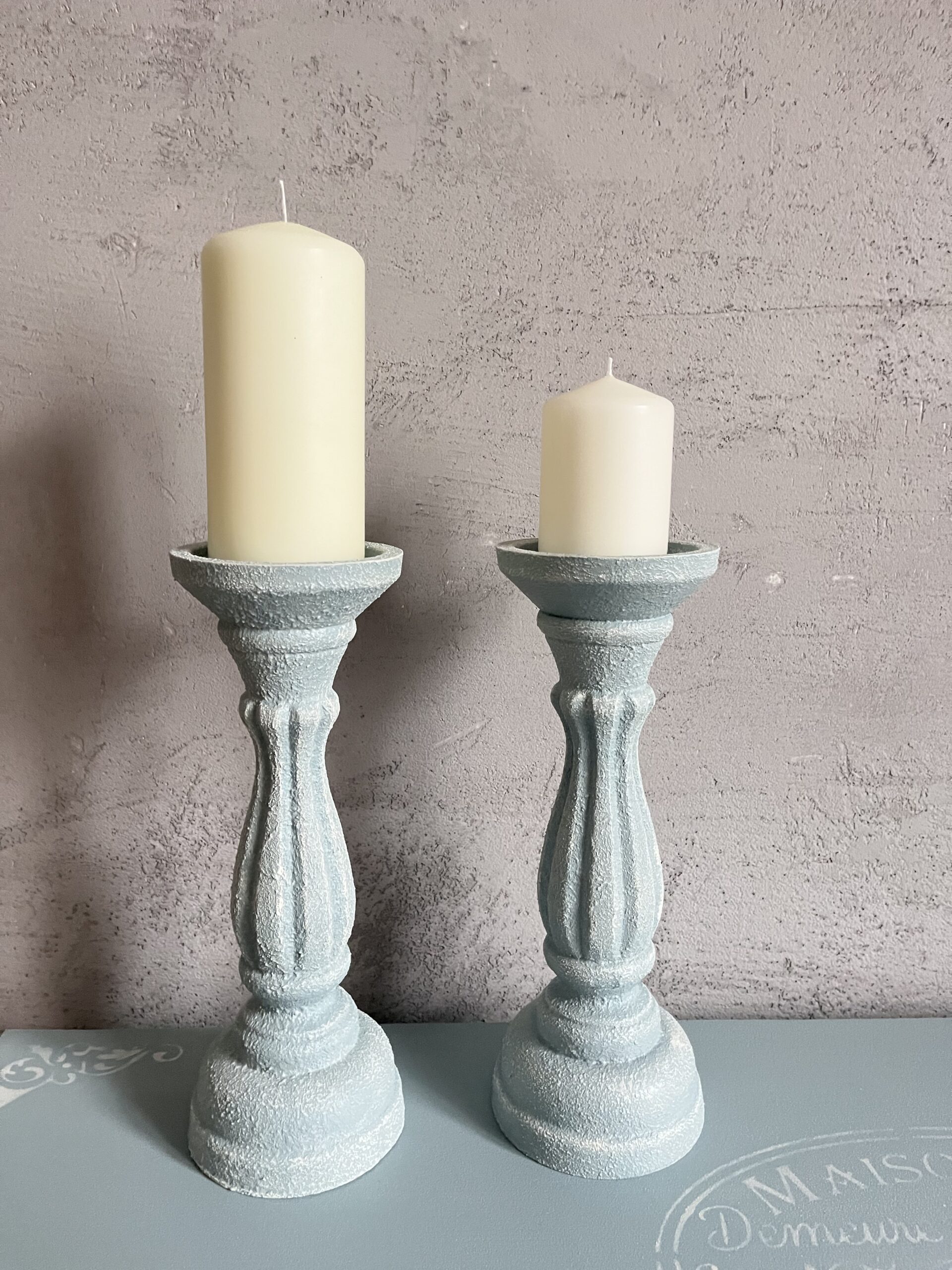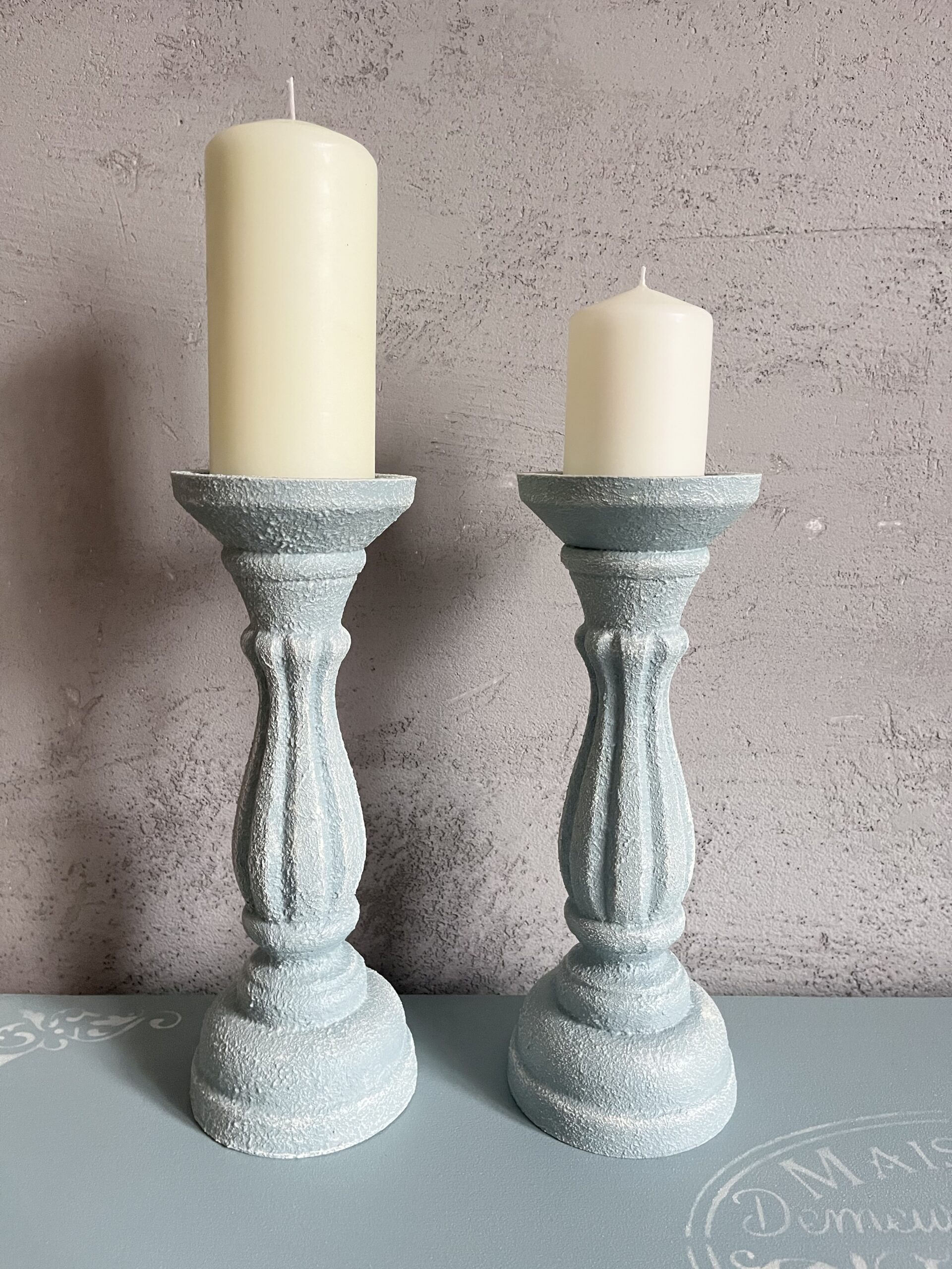 Błękitny, delikatnie bielony świecznik w stylu shabby chic. Bielenie subtelnie podkreśla detale. Świecznik pasuje do stylizacji całorocznych, zarówno wiosennych jak i bożonarodzeniowych.