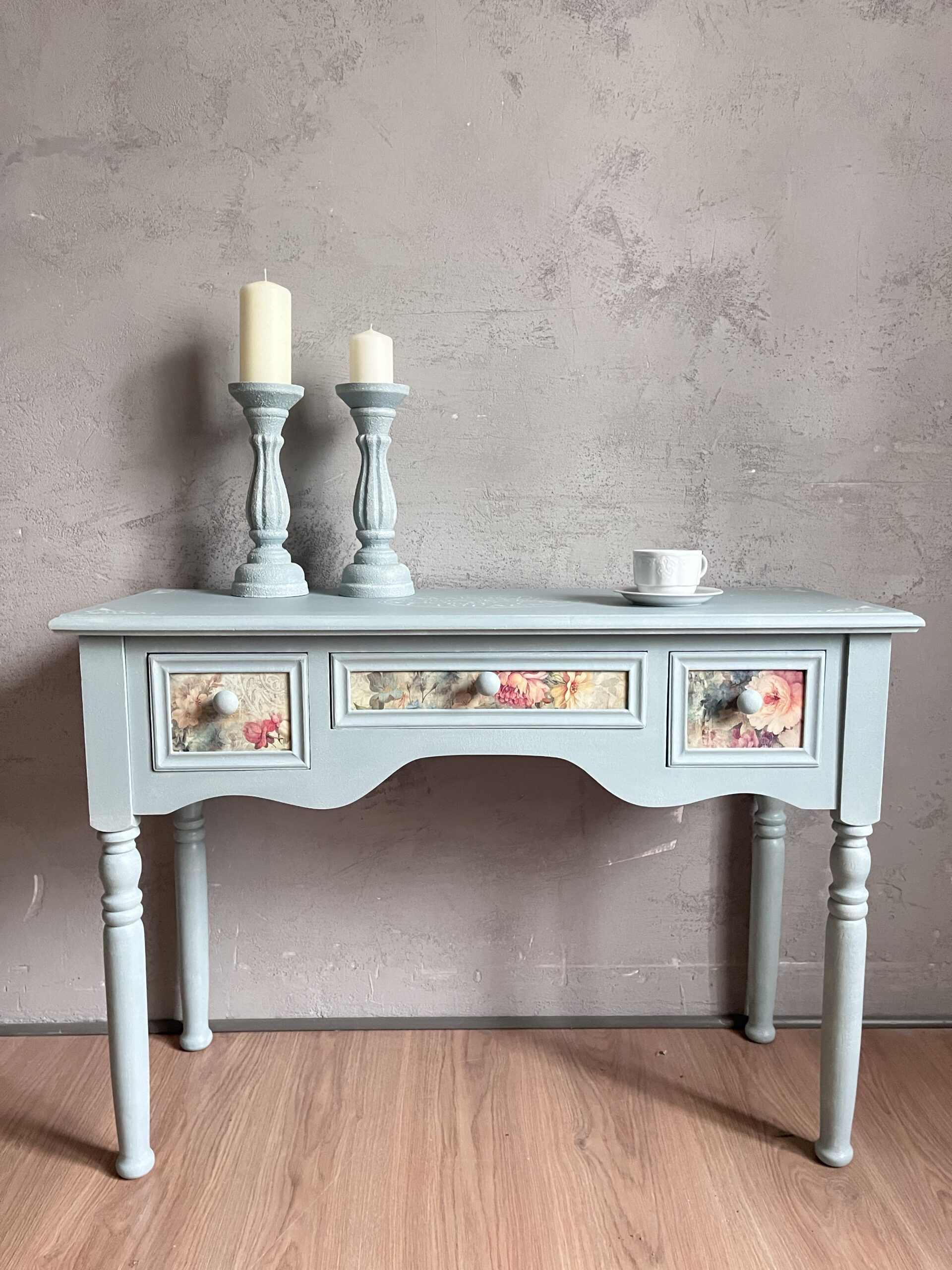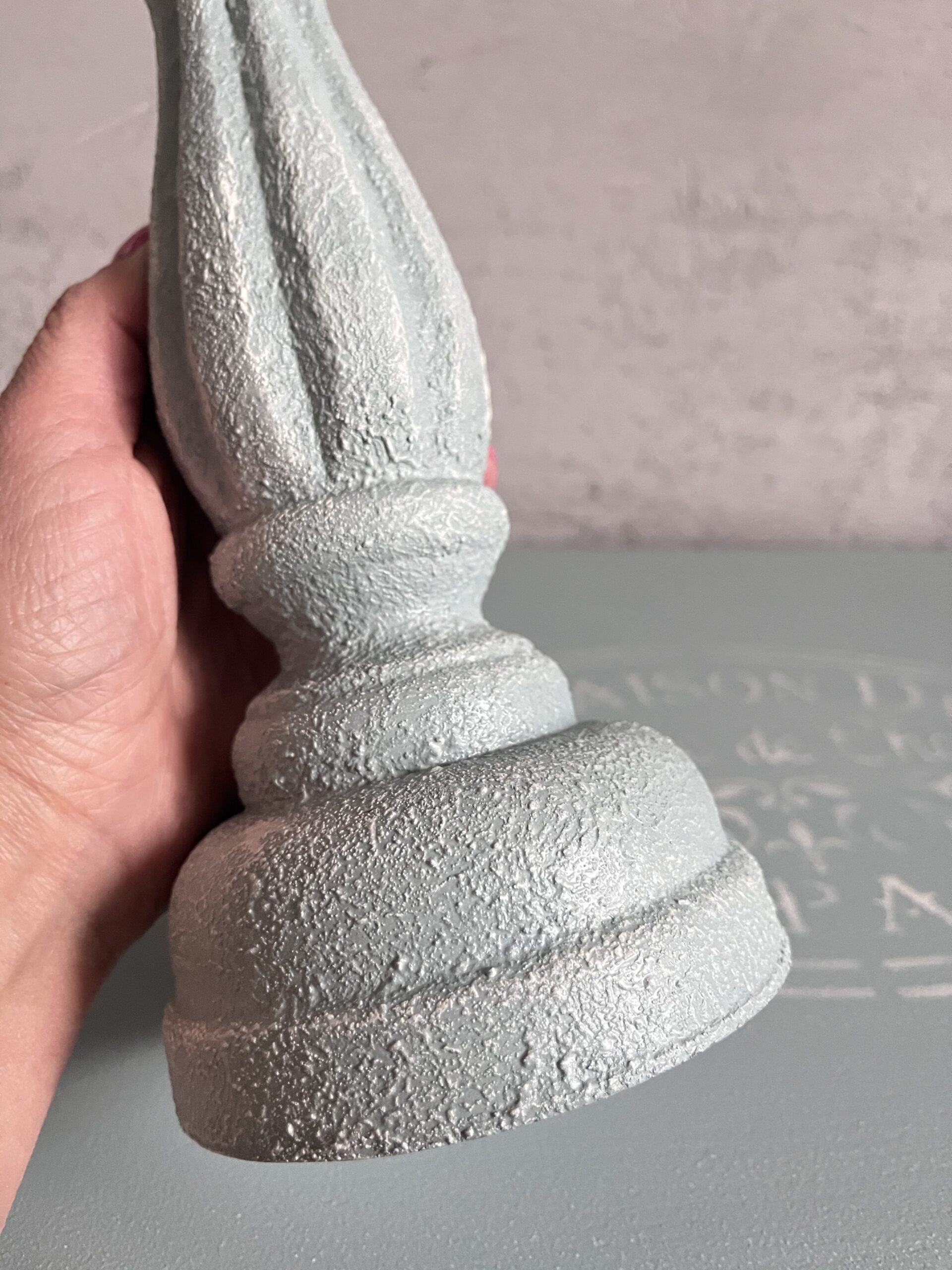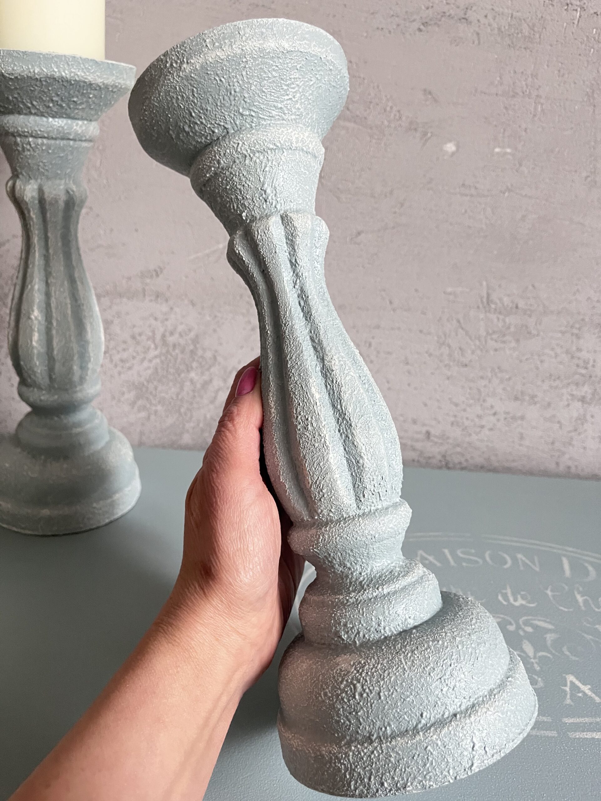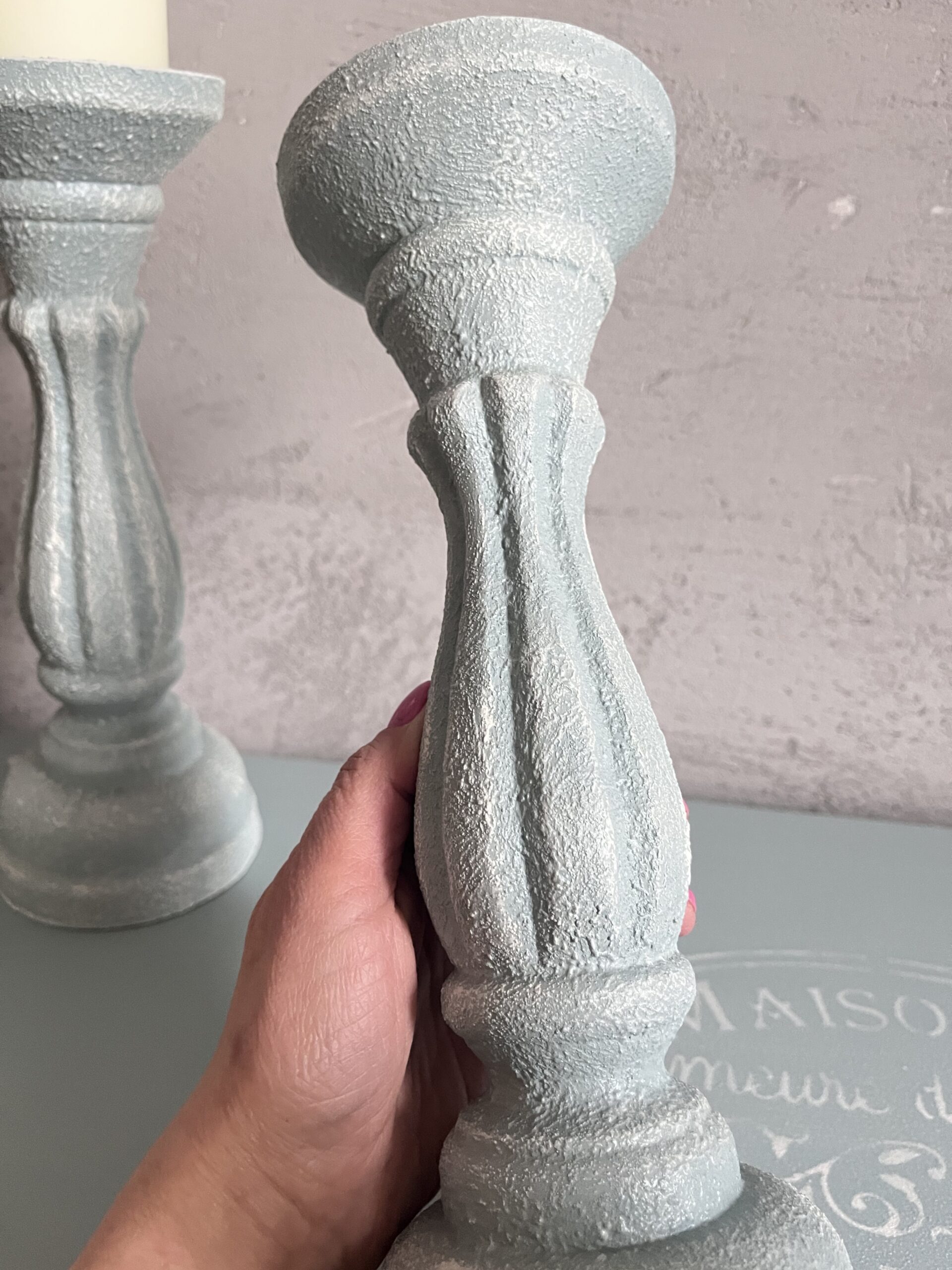 Błękitny, delikatnie bielony świecznik w stylu shabby chic. Bielenie subtelnie podkreśla detale. Świecznik pasuje do stylizacji całorocznych, zarówno wiosennych jak i bożonarodzeniowych.
