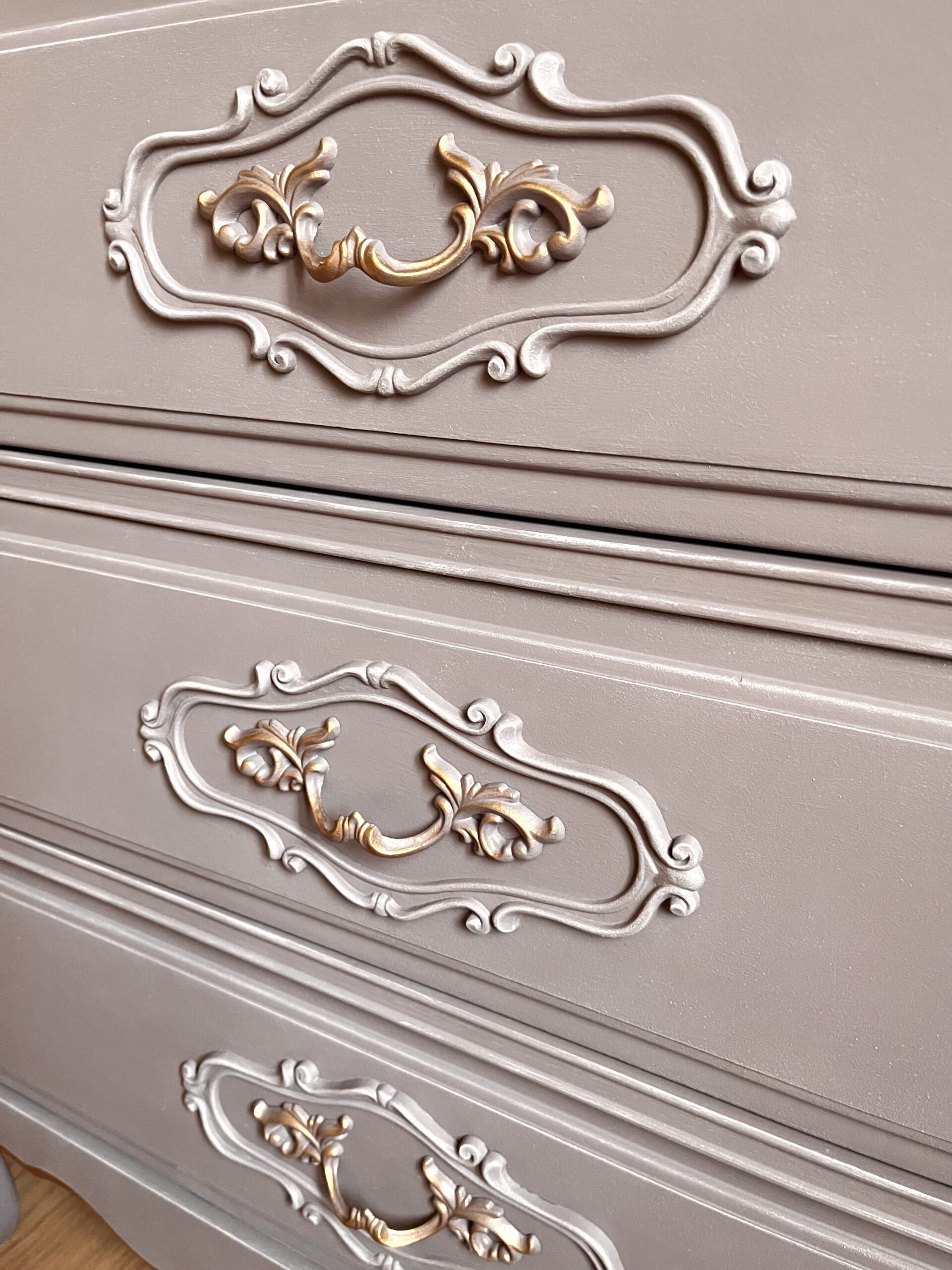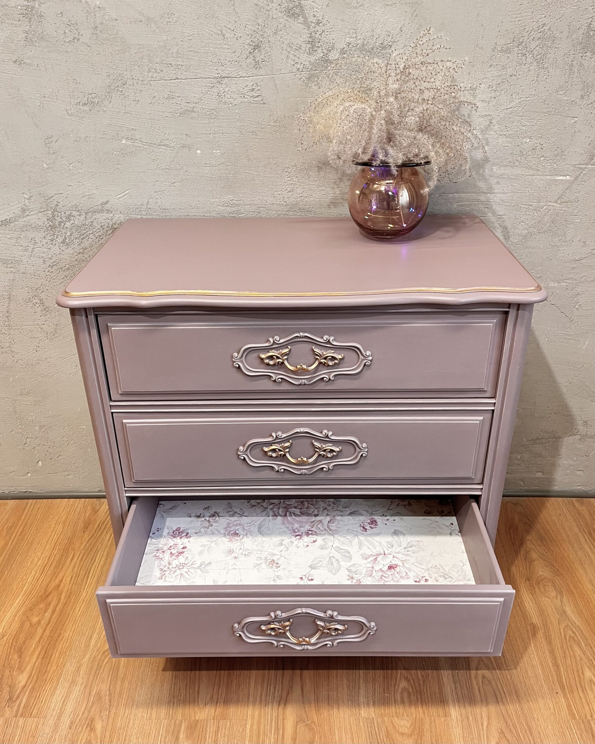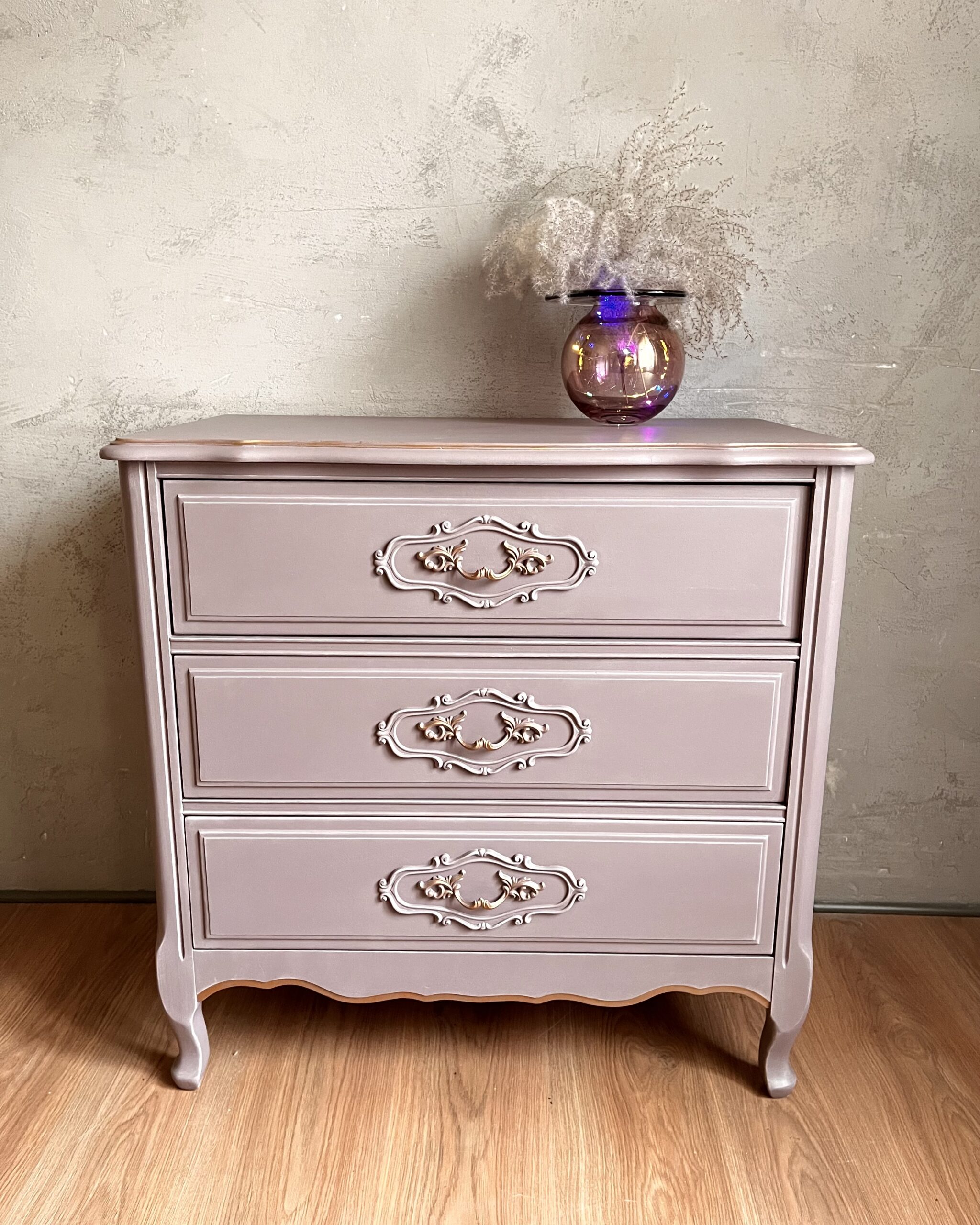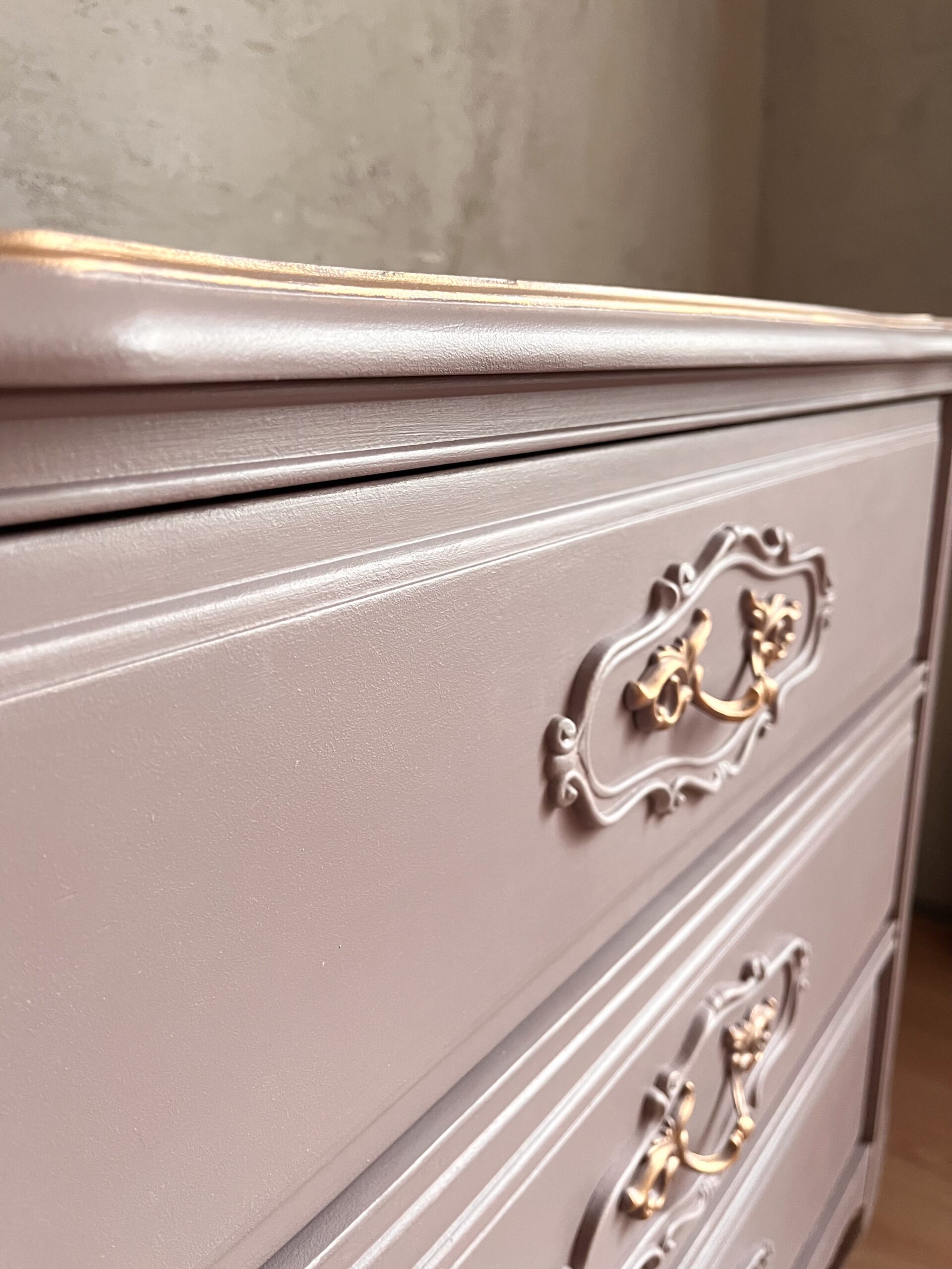 Komoda o klasycznej linii, z giętymi nóżkami i dekoracyjnymi frontami i bokami. Jej wyjątkowy kolor – lawendowy, przygaszony róż – wprowadza do wnętrza spokój i lekkość, a delikatne złocenia podkreślają elegancki charakter mebla.