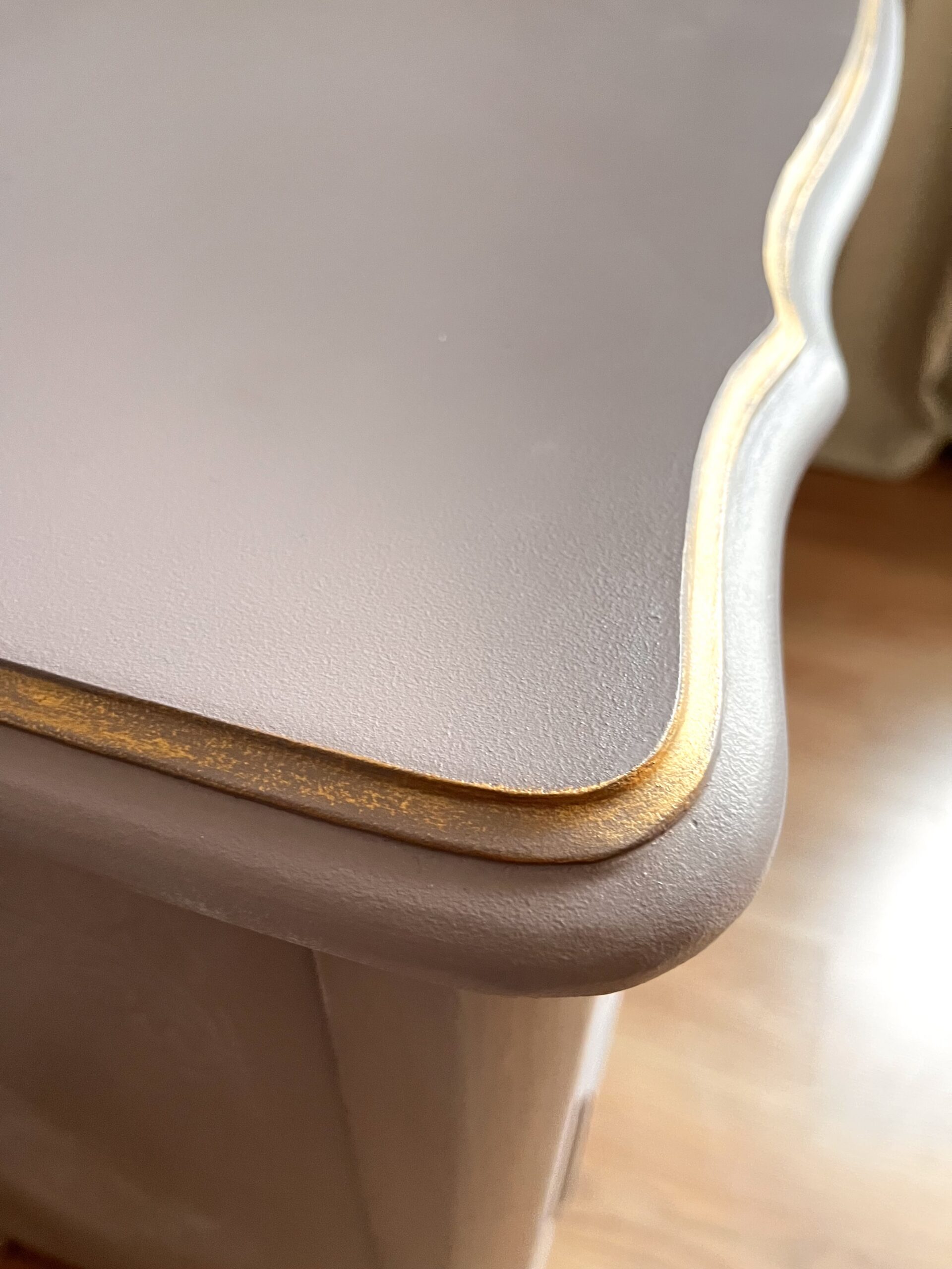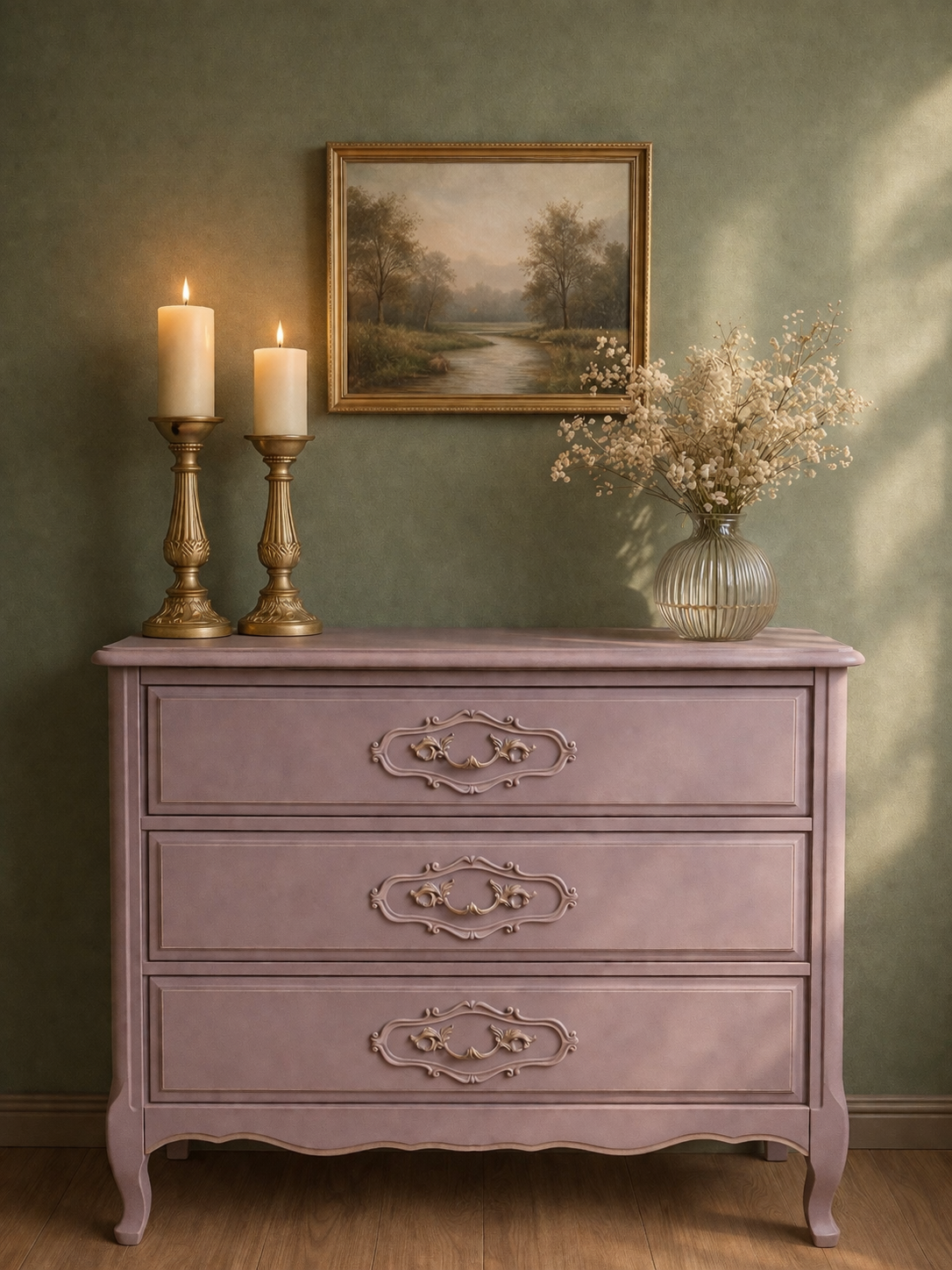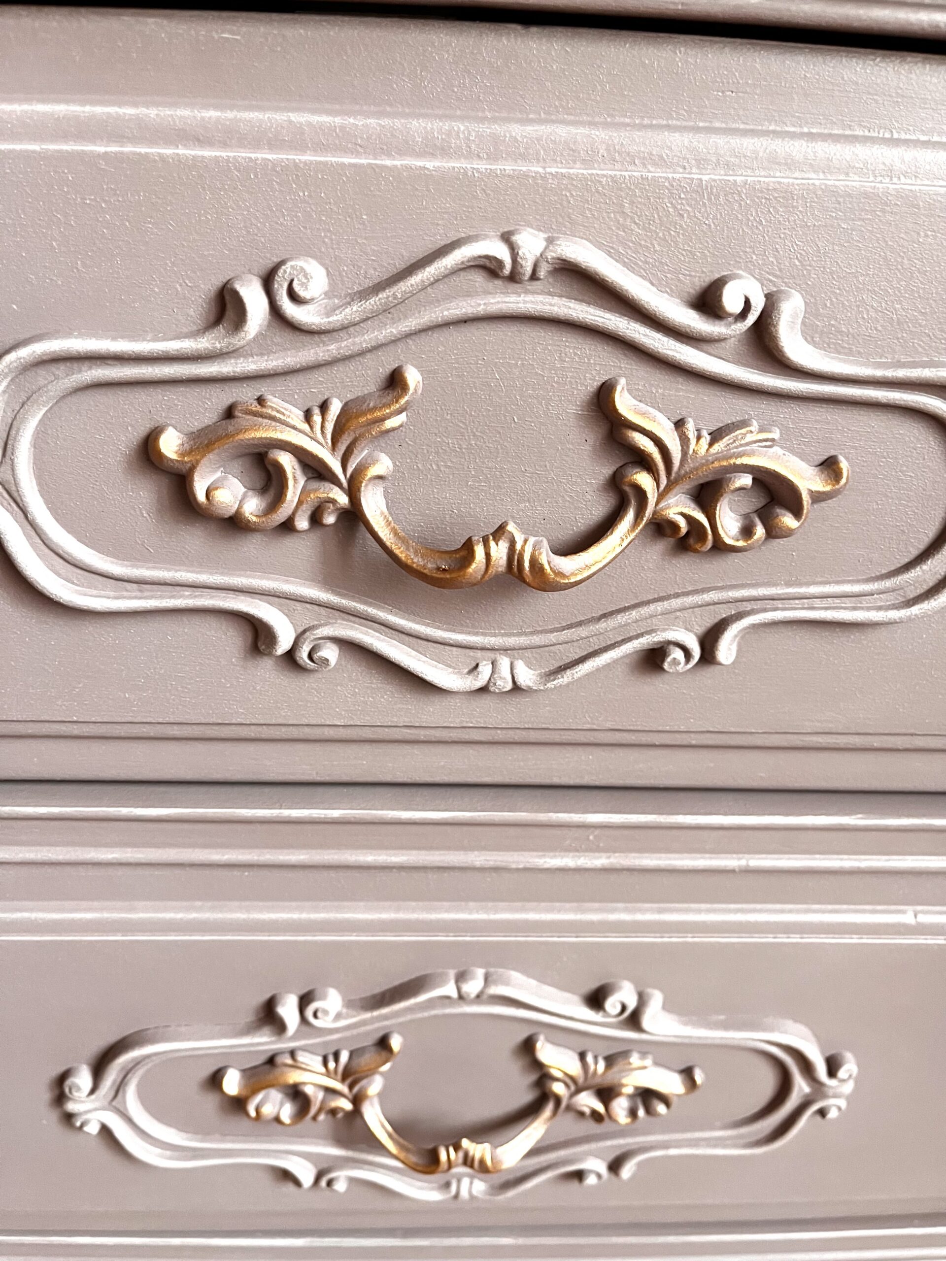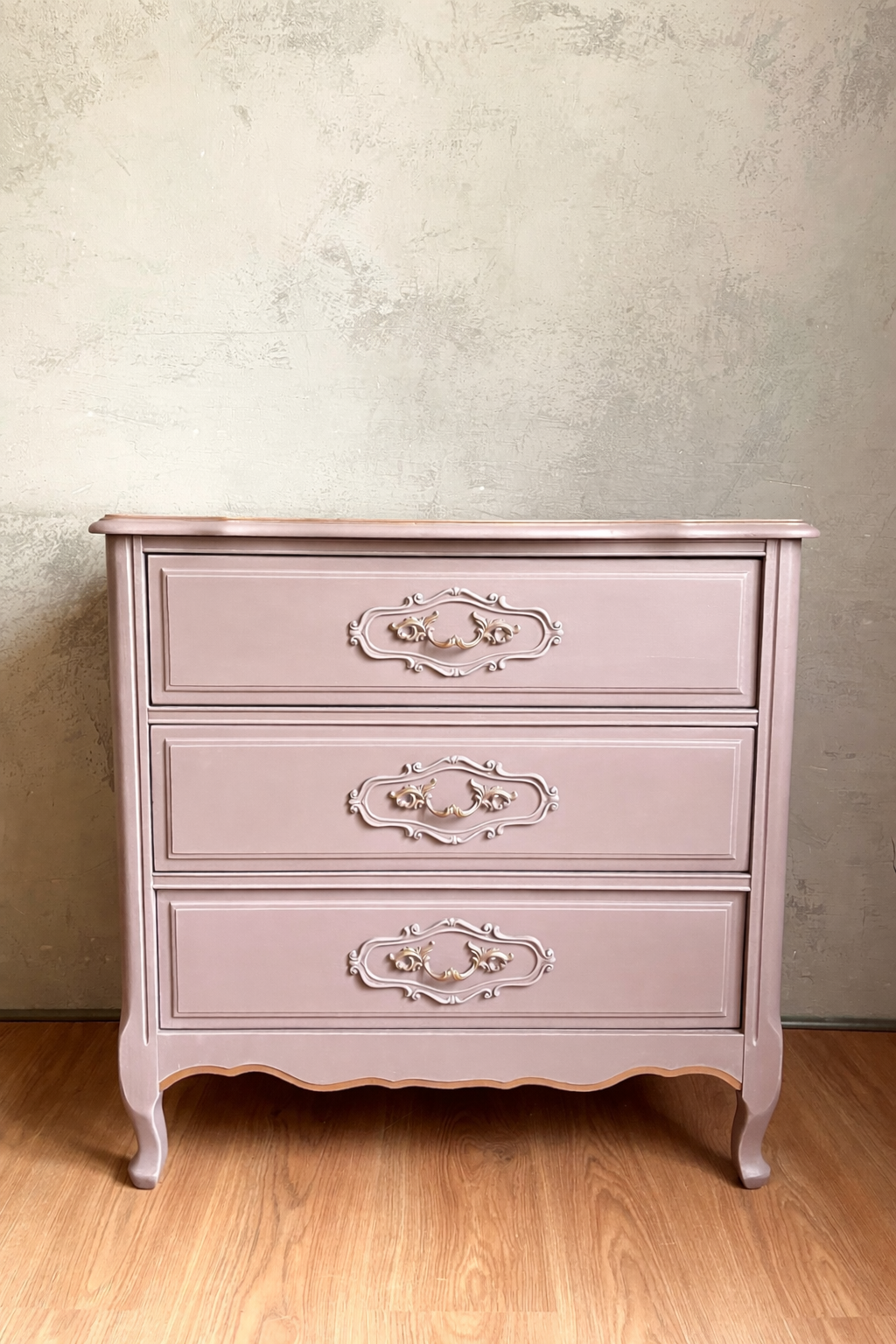 Komoda o klasycznej linii, z giętymi nóżkami i dekoracyjnymi frontami i bokami. Jej wyjątkowy kolor – lawendowy, przygaszony róż – wprowadza do wnętrza spokój i lekkość, a delikatne złocenia podkreślają elegancki charakter mebla.