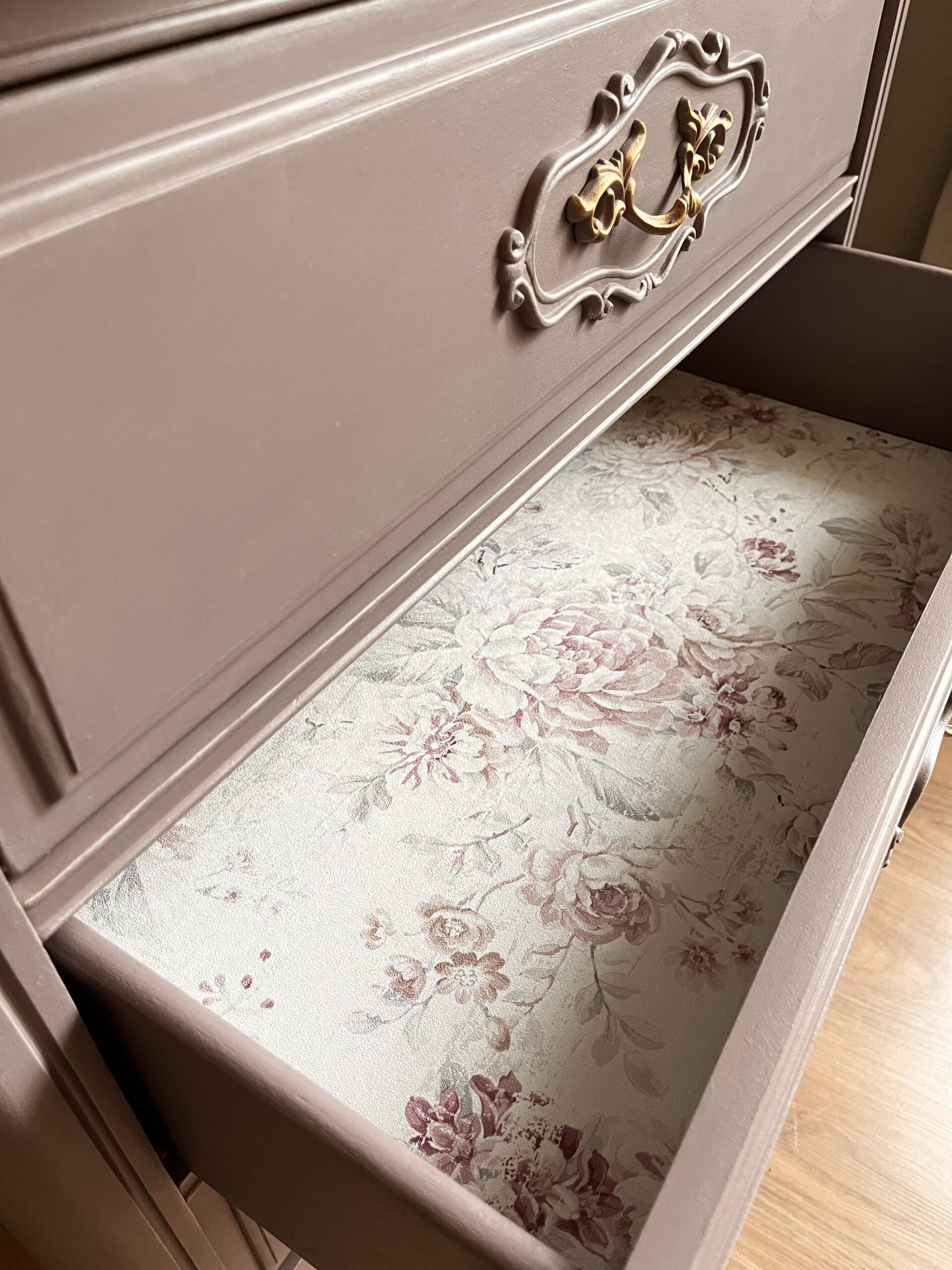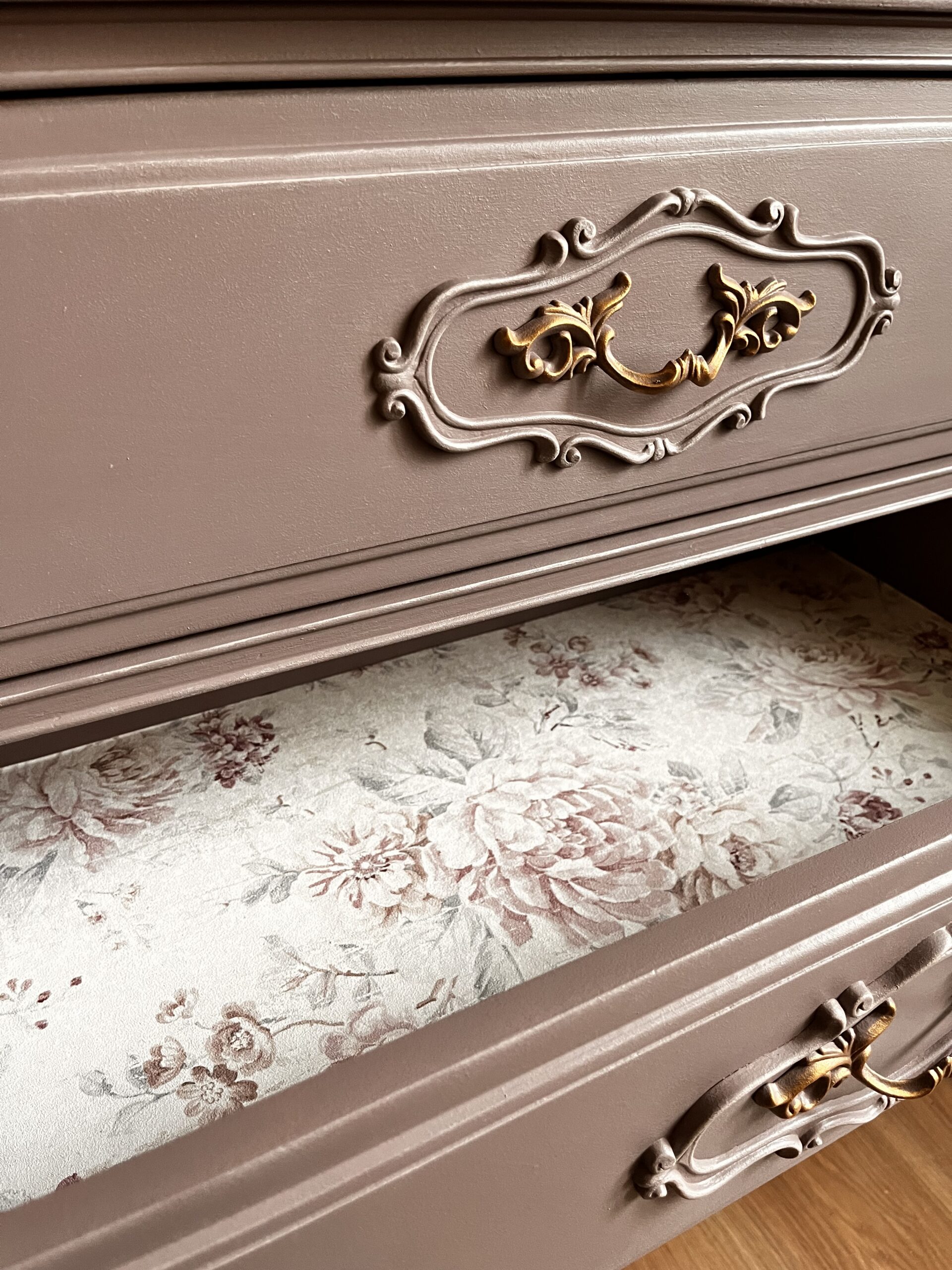 Wnętrza szuflad wykończone zostały starannie dobranym kwiatowym wzorem w stylu vintage. To detal, który pozostaje niewidoczny, a jednak definiuje charakter mebla i sprawia, że korzystanie z niego staje się jeszcze przyjemniejsze.
