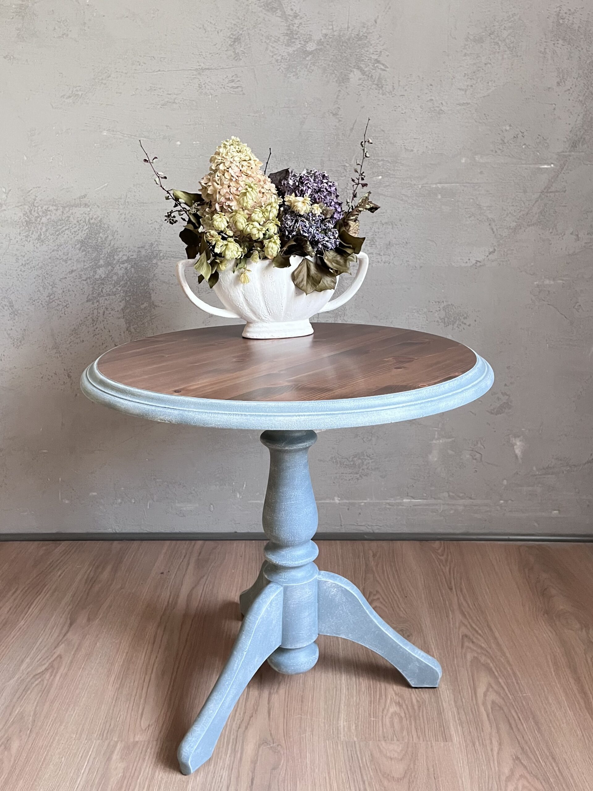 Nieduży stoliczek o klasycznej formie, który łączy w sobie ciepło naturalnego drewna z subtelną jasnoniebieską podstawą o przecieranym wykończeniu. Naturalny blat w kolorze orzecha pięknie eksponuje usłojenie drewna, a toczona noga nadaje całości lekkości.