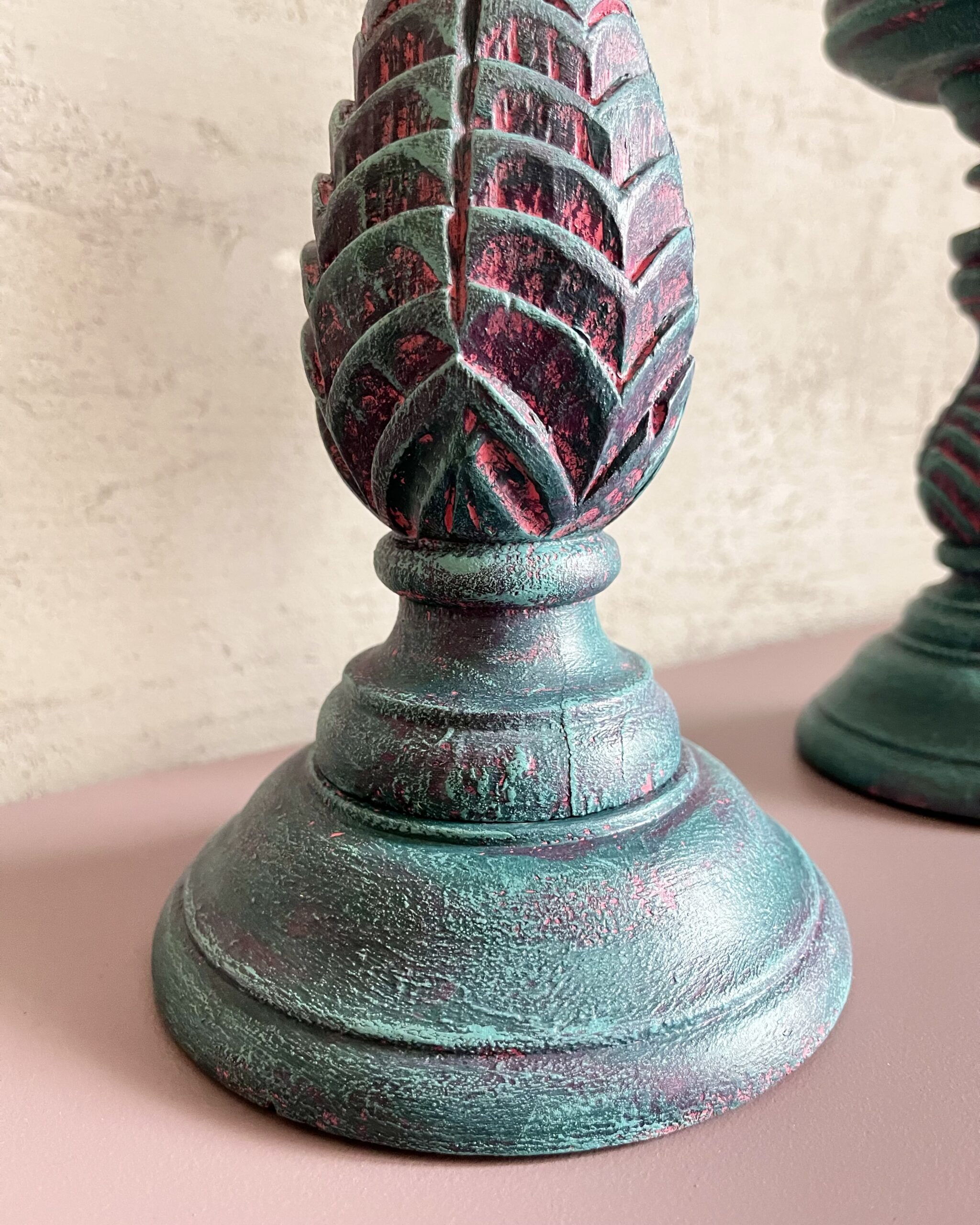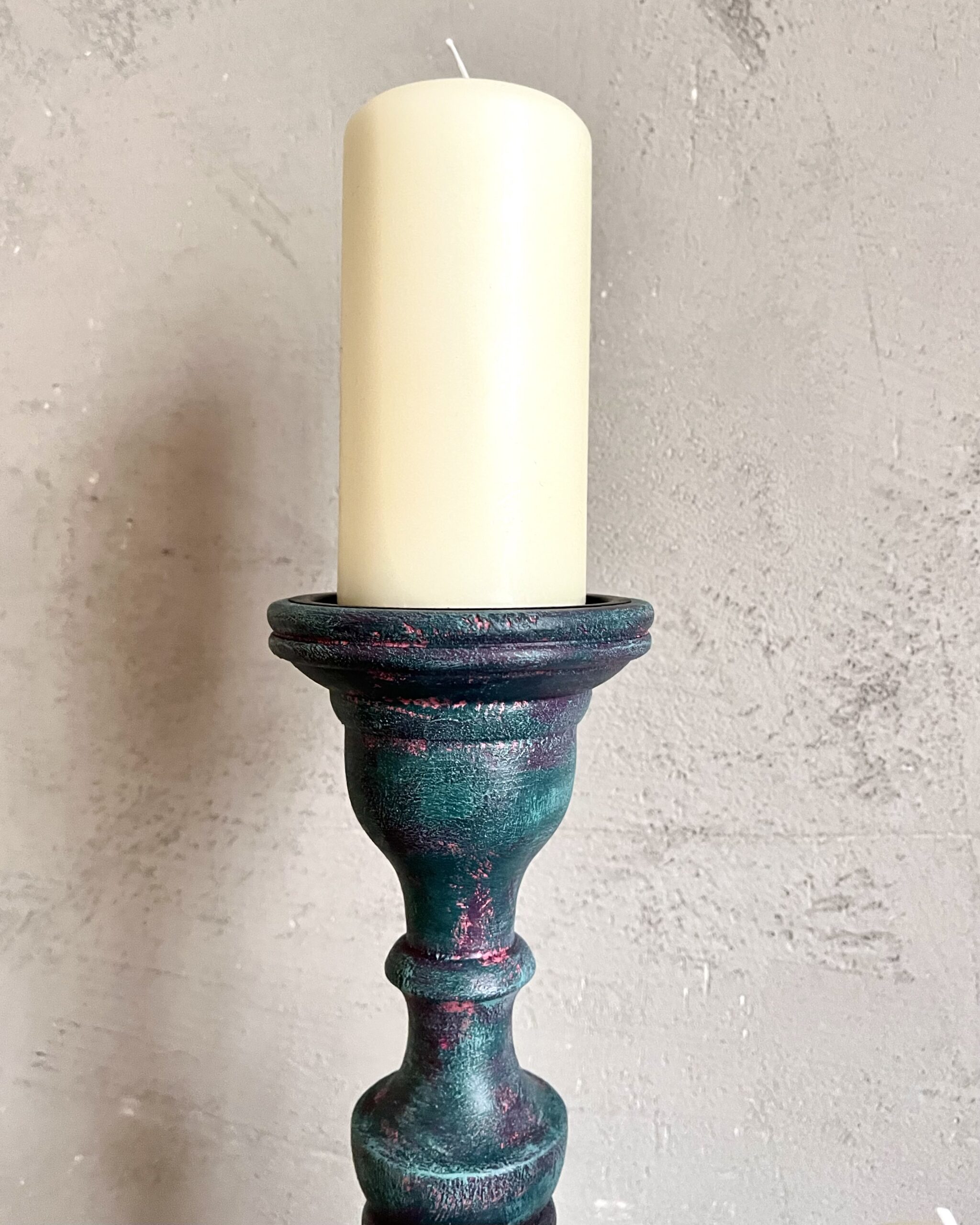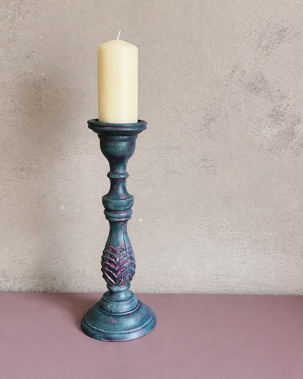 Głęboki turkus przełamany subtelnymi przetarciami w odcieniu fioletu i różu wydobywa detale i podkreśla dekoracyjny charakter świecznika. Powierzchnia z lekką strukturą i ręczne wykończenie sprawiają, że każdy fragment wyglada inaczej – i właśnie w tym tkwi jego urok.