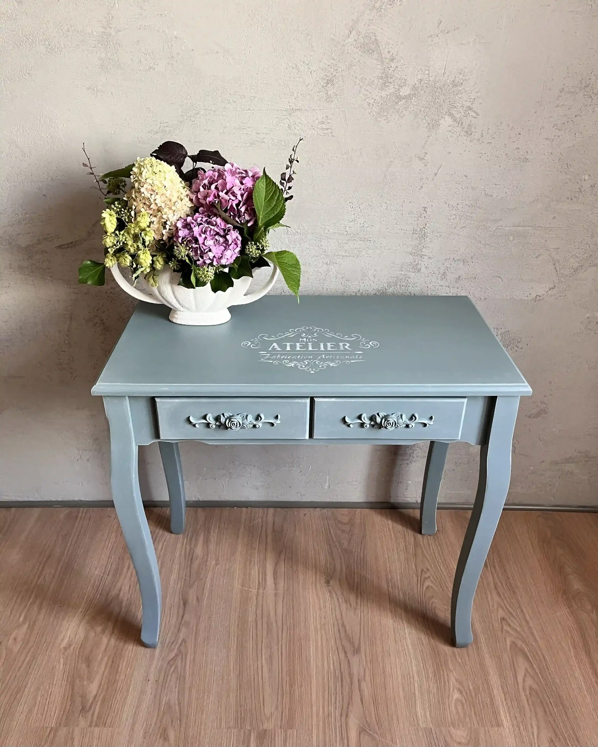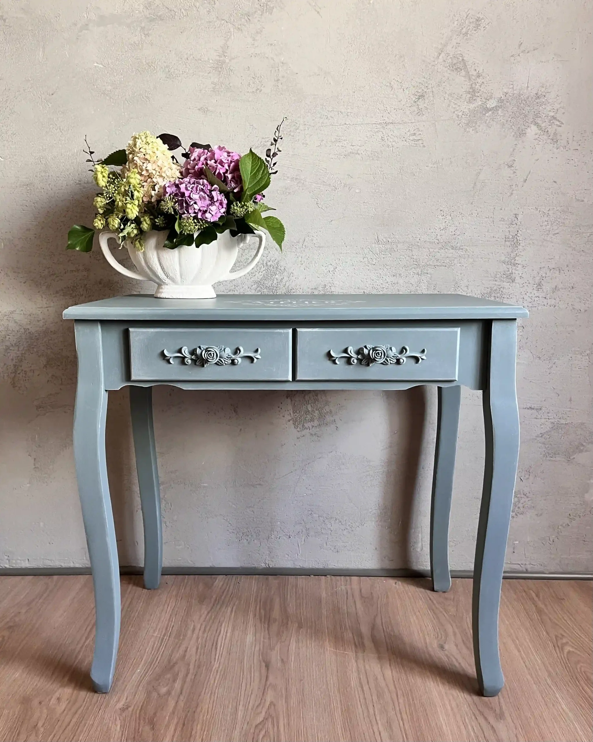 Delikatna konsolka w przygaszonym, niebieskim odcieniu łączy prostą formę z dekoracyjnymi detalami. Dwie praktyczne szufladki zdobione roślinnym ornamentem dodają meblowi romantycznego charakteru.